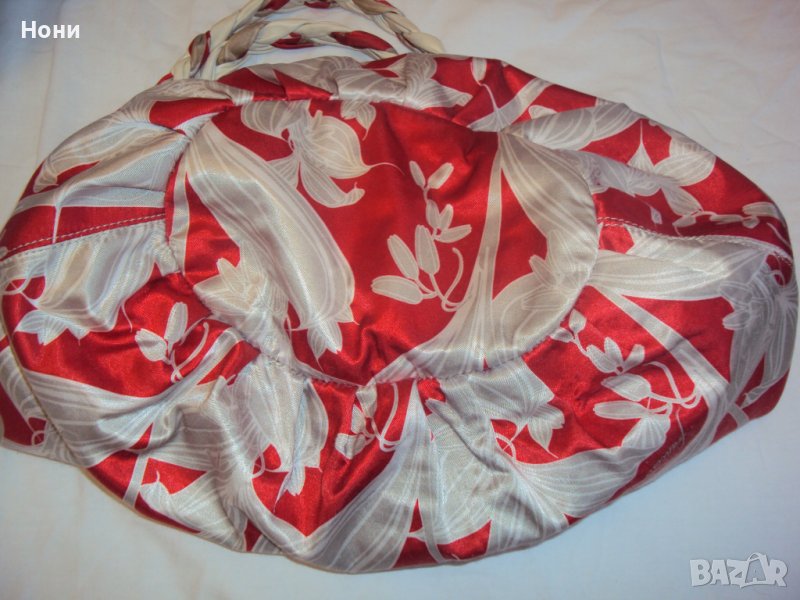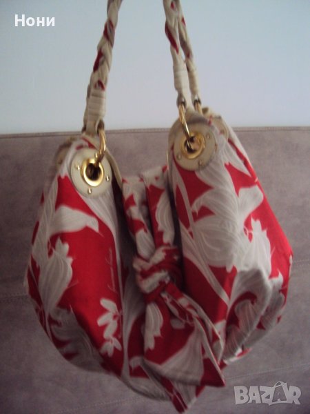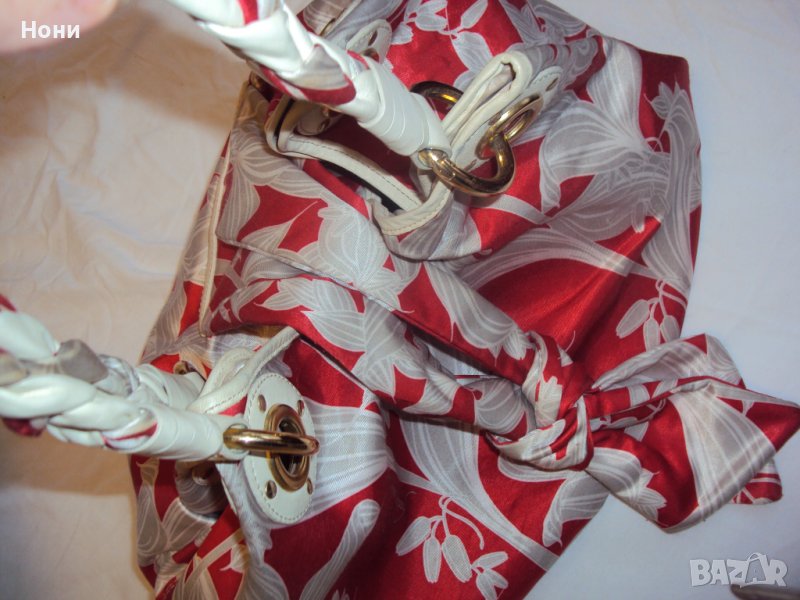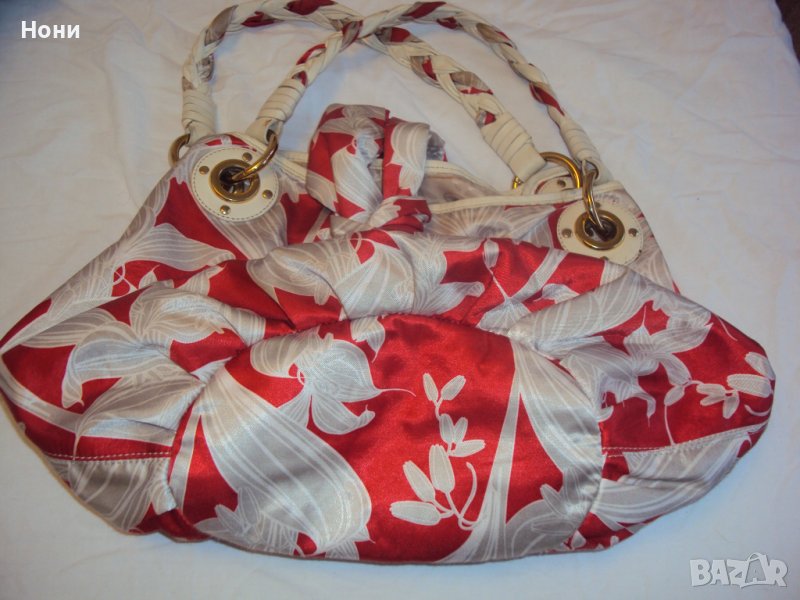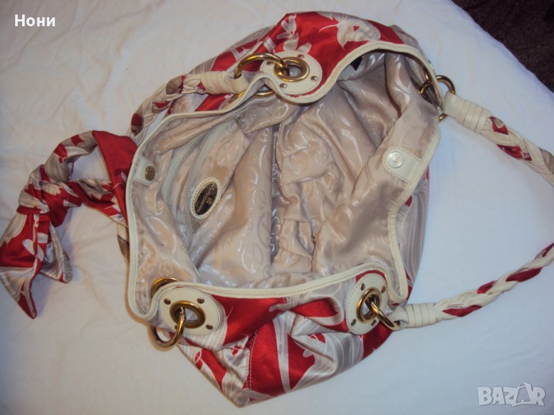 Чанта Francesco Biasia 1977. Оригинална. Носена и запазена, естествена кожа и текстил. Обковът е от жълт метал. Текстилът е сатиниран. Чантата е тип ТОРБА. Дръжките са преплетени от кожа и сатен. Единствената забележка е на последната снимка, но това не се набива на око като се носи. Малко петънце! Вътре е с подплата. Има и лого на МАРКАТА. От едната страна има джоб със цип, а от другата две отделение за телефон. Размери: Измерена по средата е 42 см ширина понеже е тип торба , това е като основен ориентир . А височината е 34 см. Много красива чанта. Купена от чужбина! Възможен коментар!