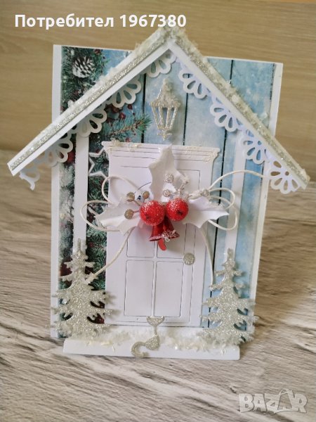 Картичка, която имитира къщичка с входна врата, интересен покрив, декорирана със сребърни елхички, сняг, замръзнали плодчета, звънче и малка котка, която чака да й отворят врата :)