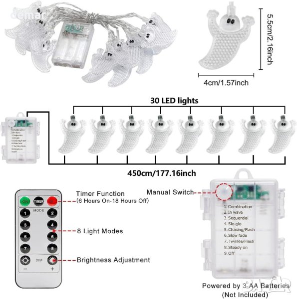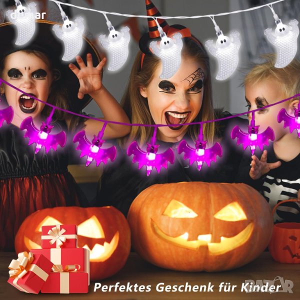 Светлините за Хелоуин са в три завладяващи стила: призрак, прилеп и тиква, всяка с размери 4,5 метра с 30 LED светлини. Тези струни са достатъчно дълги, за да създадат перфектна атмосфера за Хелоуин и да добавят забавление към вашето празнично парти. Светлините предлагат три режима: изключени, постоянно включени и мигащи, което ви позволява да пестите енергия през деня и да създавате вълнуваща атмосфера през нощта. Захранват се с батерии (3 AA батерии не са включени), осигурявайки удобство и лекота както за вътрешна, така и за външна употреба, с най-малко 48 часа непрекъснато осветление. Изработени от висококачествени материали, тези светлини са издръжливи, ярки и водоустойчиви (клас IP65), гарантирайки безопасност и дълготрайност (забележка: кутията за батерии не е водоустойчива). Тези приказни светлини за Хелоуин са идеална декорация за Хелоуин, Коледа, Деня на благодарността и различни партита, като лесно създават интересна и празнична атмосфера във всяка стая.