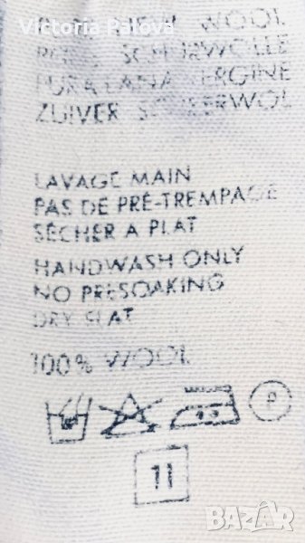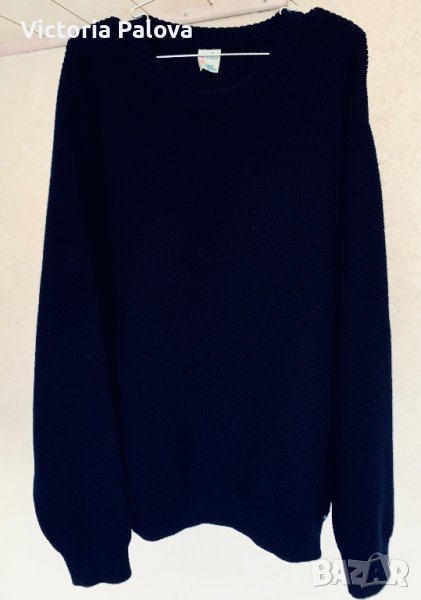 Изключително красив качествен пуловер от чиста вълна, едра плетка, разкошен и много удобен - свободна кройка, широк ръкав. Цветът е тъмносин до черно. Рамо - 59см , ГО - 66см, дължина - 74см, ръкав -65см.