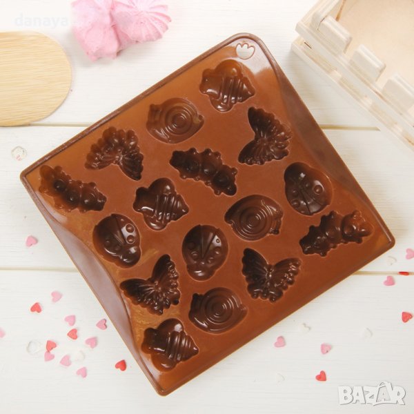 Силиконова форма за шоколадови бонбони, карамелени бонбони или други дребни сладки. Тавичката съдържа 16 гнезда с различна форма – пчеличка, пеперуда, калинка, гъсеничка и охлювче. Формата е изработена от силикон, издържа на температура от -40 до 220 градуса. Идеална е за отливка на шоколад и карамел. Може да се използва и като форма за лед.