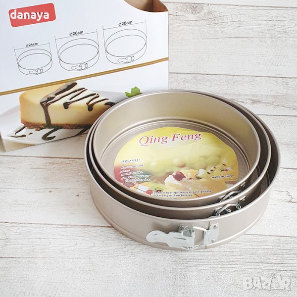Комплект от 3 броя тави за печене с падащо дъно в кръгла форма. Комплектът включва 3 различни размера – диаметър: 24см; 26см и 28см. Всяка от тавичките има падащо дъно с откопчаващ борд. Формите са подходящи за приготвяне на чийзкейк и други желирани или тестени сладкиши.