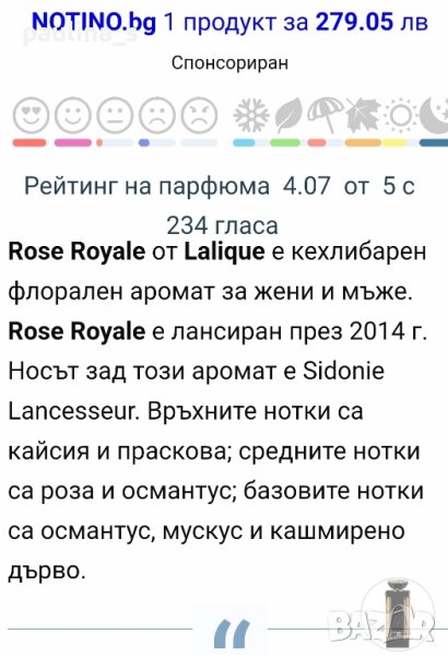 Поради новите правила за заплащане на обновяванията на обявите, моля разгледайте и последните страници на профила ми, обявите са активни и евтини. Дамски парфюм с голяма трайност и сияж, прекрасен е. Тестер, купен е с код от доверен сайт, преди известно време, затова е на тази цена. Продам го, защото се нуждая от парите. Липсват около 17ml, не е ползван интензивно, защото си го пазех за специални ивенти. Информацията и ароматната пирамида са от Фрагрантика, това е бижу в бутилка! Моля, разгледайте и другите обяви и последвайте профила. Приятно разглеждане. Може да създадете пакет и да използвате доставката, тогава ще направя отстъпка от общата цена. При единична поръчка, цената не се коментира по никакъв начин, продажбата е с благотворителна цел! За лечение! Благодаря за вниманието и отделеното време 🙂