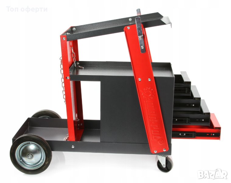 Количка за телоподаващи и аргонови / заваръчни апарати и електрожени MAR-POL M66612 с 4 чекмеджета. Оборудвана е с 4 колела, 2 от които са със спирачки. Газовата бутилка може да бъде поставена от задната страна на количката, която може да бъде сигурно закрепена с помощта на две вериги. Отгоре може да бъде разположен заваръчният апарат.