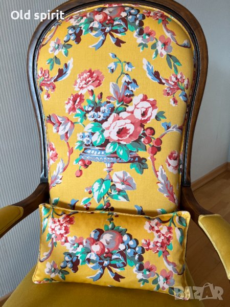 Дървената част на креслото е освежена, а изборът на основната тема на дамаската е в меден цвят.