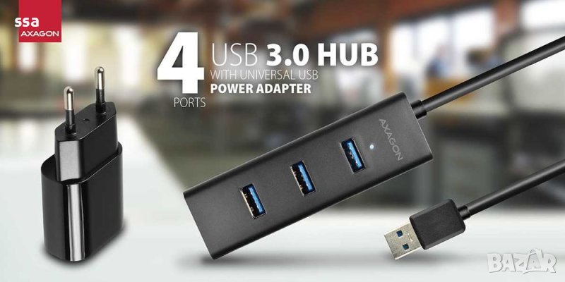 Четирипортовият AXAGON HUE-S2BP USB 3.0 хъб с USB кабел с дължина 1,2 м, захранващ адаптер и поддръжка за бързо зареждане на всички портове.