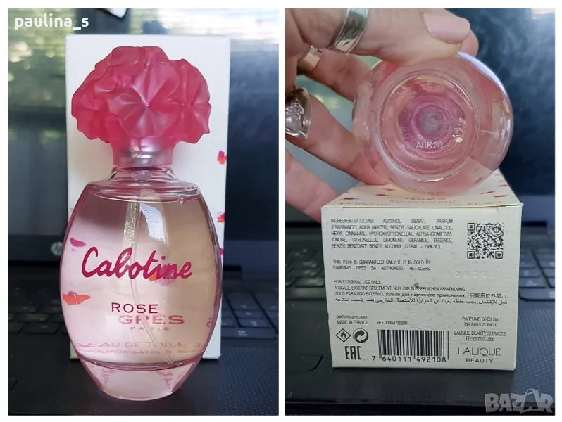 3️⃣. Колаж / Дамски парфюм "Rose" Cabotine by Lalique / 100ml EDT / France. Стар бач код от преди 5 или 6г AOK20, истинско съкровище. Цената е крайна, без пазарлъци 30 евро. Според Фрагрантика Наподобява / Вдъхновен от Сакура на Диор / "Sacura" by Christian Dior. Липсват 2 фъса за проба, пълна презентация продукт с кутия, съхраняван на тъмно.