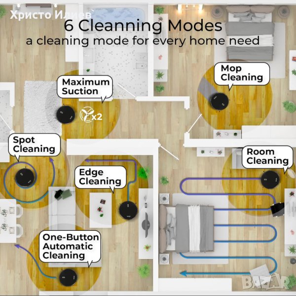6 РЕЖИМА НА ПОЧИСТВАНЕ: Автоматично, локализирано почистване за особено замърсени зони, почистване на ръбовете покрай стените, почистване на стаята за изпълнение на всички програми в специално предназначено помещение, функция за почистване с моп и максимално засмукване за 2 пъти повече мощност. С функция за ежедневен график за почистване. Подходящ за всички видове подове: паркет, плочки, килими до 1,8 см.