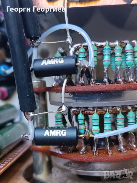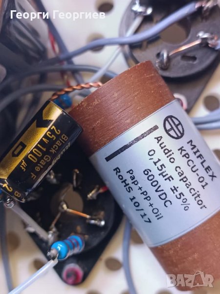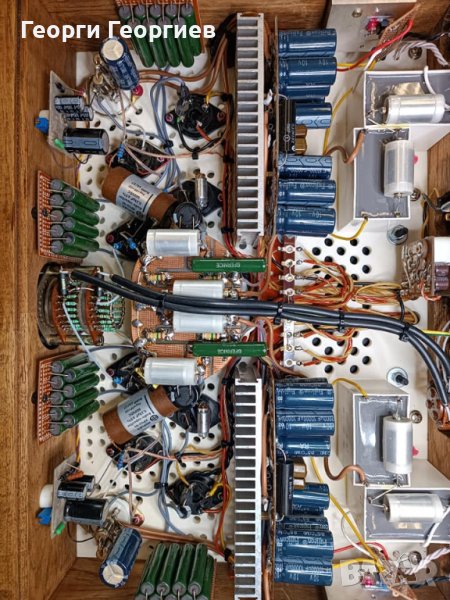 лампов усилвател без ООВ. Изходни трансформатори LUNDAHL LL1623/120mA. Входна лампа 6П9 с фиксирано преднапрежение с катодни кондензатори Rubycon Black Gate, стабилизирано напрежение на решетката посредством газови стабилизатори; изходен тандем лампи - PL36+Г811, също с фиксирано преднапрежение. Кондензаторна връзка между първата и втората лампа с едни от най-добрите кондензатори на пазара в ценовата си категория - Miflex KPCU-01 (медно фолио с хартия и полипропилен в масло). Галванична връзка между втората лампа и Г811. Изправено отопление за 811(CRC-филтър) с общ филтриращ капацитет 140 000 uF/канал и сребърно-слюдени шунтове, активни изправителни елементи на VISHAY. Галетен регулатор на усилването - NOS 24-позиционен ключ на RFT с посребрени контакти и резистори на Amtrans AMRG Carbon Film и Takman Metal Film. Галетен превключвател за два входа. Входни и изходни конектори с родиево покритие. Независимо хибридно (вакуумно-полупроводниково) изправяне на анодното напрежение за всеки канал посредством 5Ц3С с черни аноди и Ultrafast Soft Recovery Diodes, електронни дросели за всеки канал с активни елементи на VISHAY, кондензатори по захранване индустриални високоволтови полипропиленови KEMET MKP, електролитни EPCOS и Rubycon със стирофлексни шунтове, автоматика за закъснително подаване и плавно нарастване на анодното напрежение с цел удължаване живота на лампите. Другите видове използвани резистори - безиндуктивни жични на SFERNICE (по 11W мощност всеки) - общо 38 броя, TESLA, MULTICOMP Pro. Сигнално окабеляване със сребърен проводник на Nimak, AWG24(0,5мм), чистота 5N (99,999%), връзката между изводите на изходните трансформатори и изходните терминали е реализирана с тройка усукани Kimber TCSS Hyper-pure Copper VariStrand проводници. Захранващият трансформатор е с дебелина на ламелите 0,25мм и ниска индукция на разсейване. Корпус от масив дъб антик, шаси и елементи по корпуса от технически камък (Corian). Само малко за звука. С 15-те си вата на канал нискочестотния регистър е ураганно мощен и бърз и с отлична артикулация, в същото време високите са с много финес, релеф и детайли и с перфектна микродинамика дори и при тихо слушане. И спирам да говоря, който има интерес ще дойде да го чуе :-) Усилвателя е изключително подходящ за студените зимни вечери и гарантира чувствителна икономия на използваната топлоенергия от Топлофикация :-) Продава се БЕЗ захранващ кабел. При сериозен интерес може да бъде чут при мен на Open Baffle - озвучителни тела Yamaha NS-18. Само лично предаване.