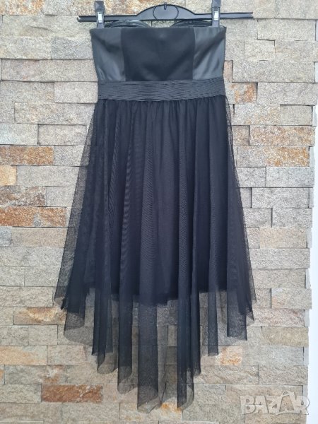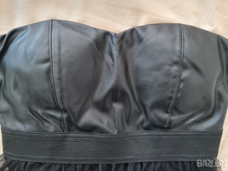 Дамска рокля, размер XS, кожена горна част.По средата между гърдите има дребна забележка, имаше някаква декоративна брошка, която съм махнала. Само е пробвана роклята, така и не е носена.
