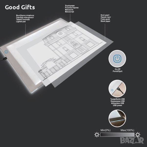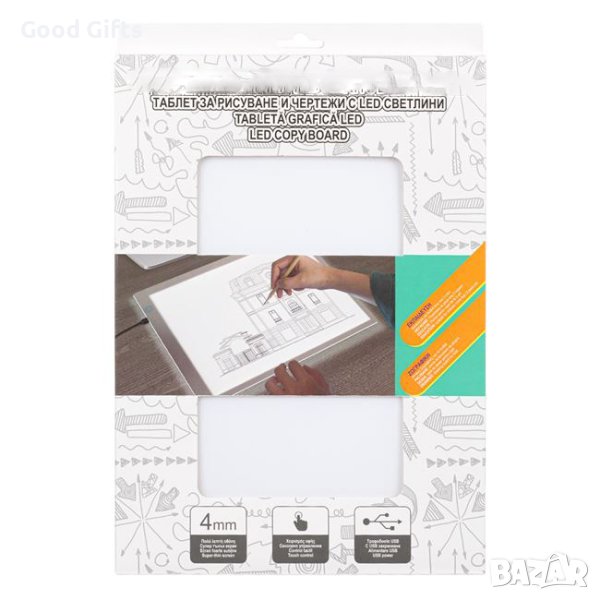 Изключително удобен помощник за рисуване или чертане, който може да се използва както от любители, така и от професионалисти. Върху осветената повърхност се поставя листът хартия, на който ще работите и по този начин всички детайли от рисунката или чертежа са идеално видими. Осветената повърхност е с тънък дизайн, само 4 мм, има тъч функция и се захранва с USB кабел. Има бутон за включване/изключване, а силата на светлината може да се регулира. За работата на таблета не се изисква софтуер, трябва единствено да го включите към мрежата с USB кабела. Има вградена защита за отчите, така че е подходящ дори за по-продължителна работа.