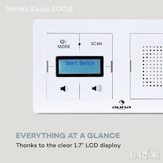 С висококонтрастния 1,7" LC дисплей можете да съхранявате цялата важна допълнителна цифрова информация като час, изпълнител или радиостанция с един поглед по всяко време. Благодарение на Bluetooth функцията, безброй музикални файлове могат да се възпроизвеждат безжично и надеждно от вашия смартфон или таблет чрез аудио стрийминг. Освен това правоъгълното чудо на звука с мощност 1,5 вата е изключително гъвкаво и при съответното разположение на гнездата може да се монтира както вертикално, така и хоризонтално на стената. Радиото се управлява или от ясен контролен панел на устройството, или от разстояние с помощта на предоставеното дистанционно управление.