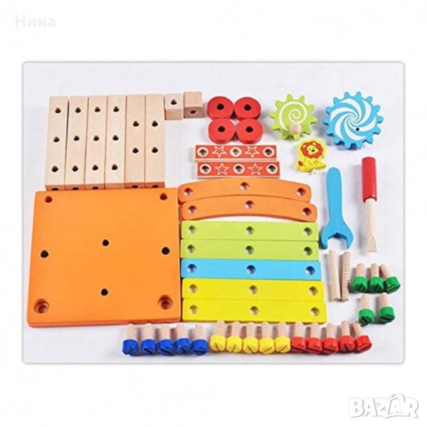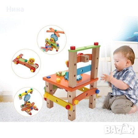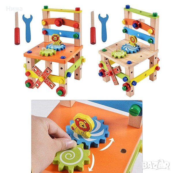 Дървен многокомпонентен строителен комплект за сглобяване на столче или други структури 🔩🔧🪑 Комплектът включва отвертка, гаечен ключ и монтажни части.