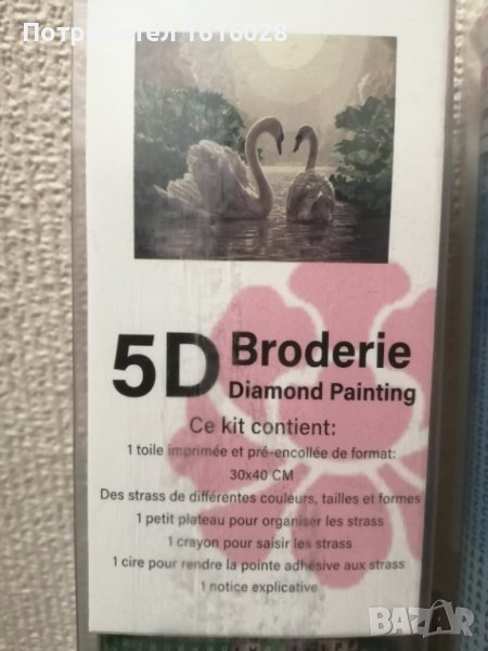 Два модела диамантени Гоблени.Във всеки комплект се съдържа по 1 отпечатано платно,стрази с различни размери,цветове и форми,1 малък поднос за подреждане на диаманчетата, 1 молив за хващане на диананчетата,1 восък и 1 обяснителна бележка.Диамантчета се подреждат на определените места,като се следват буквите,знаците и цветовете отговарящи на тях.
