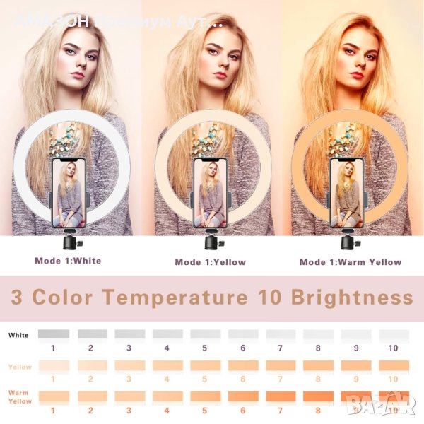 Светодиодната пръстеновидна светлина е с 3 светлинни режима и 10 регулируеми яркости по ваш избор, отговаря на всички ваши нужди при различни обстоятелства. 3 светлинни режима: бяло, топло жълто , топло жълто + бяло.