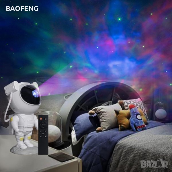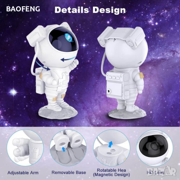 Този звезден проектор за нощна светлина е проектиран да изглежда като астронавт. Дизайнът на външния вид е новаторски и уникален, отразяващ темата за звездното небе и галактиката, а главата на астронавта е магнитно свързана с тялото, което може да бъде завъртяна на 360° позволява мъглявината да бъде проектирана навсякъде без ограничения.