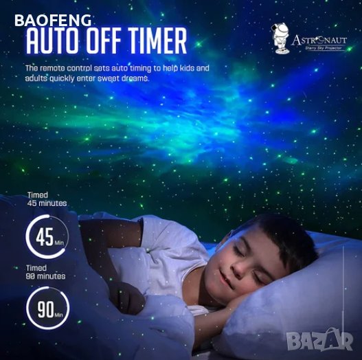 Прожекционната лампа за звездно небе на астронавта с дистанционно управление може да контролира включването/изключването на режимите на мъглявина и звездна светлина. Можете да регулирате яркостта, да промените режима на светлина и може да показва различни ефекти на мъглявина. Можете също така да регулирате скоростта и яркостта на мъглявината. Два режима на време: около 40 минути и около 90 минути, автоматично изключване, можете лесно да получите достъп до тези настройки, без да ставате.