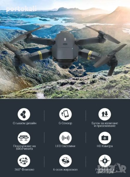 -Функции: нагоре/надолу, напред/назад, завой наляво/надясно, страничен полет, LED светлини, допълнителни режими, автоматично връщане с един бутон, режим на задържане на височината, WiFi FPV