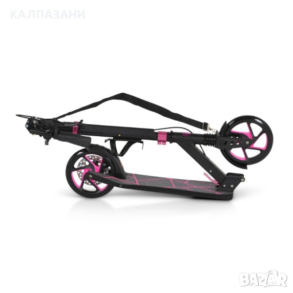 Алуминиева сгъваема тротинетка със задна дискова спирачка; PU колела с размер 200*30 мм и лагери ABEC-7; Преден амортисьор; Странична стойка; Регулируема височина на кормилото от 90 до 104 см; NBR ергономични ръкохватки с дължина 12 см; Основа за стъпване размер 545*150 мм с против хлъзгащо се покритие. Тротинетката е оборудвана с колан за пренасяне, звънец, стойка за шише за вода и предна LED светлина. Максимално натоварване до 100 кг. За деца на възраст над 8 години