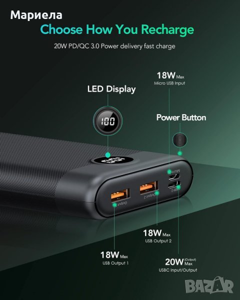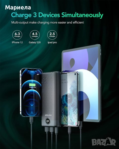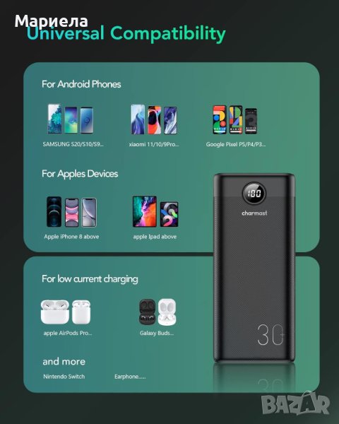Нови фабрично запечатани закупени от Германия.2 Inputs & 3 Outputs with LED Display Compatible with Samsung Huawei iPhone iPad etc.Тип конекторUSB Type C, Micro USBМаркаЧармастКапацитет на батерията30000 милиампер часаЦвятЧерно-1Специално свойствоБързо зареждане, преносимо зарядно устройствоОтносно този артикул⚡🔋【Огромен капацитет от 30 000 mAh за 7 дни употреба】 Захранваща банка с колосален капацитет от 30 000 mAh, осигурява почти седмична употреба. Удължаване на допълнителни 168+ часа за вашия мобилен телефон. Със своите 30 000 mAh може да зарежда iPhone 14/13 серия 4-5 пъти. За Samsung S21 серия 3,6-4,5 пъти, за Huawei Mate 30/40 серия 4-5 пъти. (Данните за времената на зареждане идват от лабораторни тестове, действителните резултати може да се различават за различните телефони). Идеален за пътуване, къмпинг, туризъм и други видове дългосрочни пътувания.⚡🔋【Мощен капацитет, но компактен по размер】【Мощен капацитет, но компактен по размер】 Вероятно тази батерия за бързо зареждане Charmast 30000mAh е най-компактното и по-малко преносимо зарядно устройство с 30KmAh, което някога можете да намерите на пазара. 😎🥰Тежи само 490g/17.28oz, размерите са 171x 71.5x 25mm/6.73x2.81x0.98 инча.⚡🔋【Бързо зареждане 20 W PD & 18W QC 3.0】4 пъти по-бързо от обикновеното зареждане на пазара чрез 20W PD и QC 3.0 технология за бързо зареждане. 20W PD и 18W QC са проектирани за видове USB C връзка мобилни телефони с Android като Samsung,HUAWEI,One-Plus също и за някои iPhone с активиран PD над 8Plus. (PD бързо зареждане за iPhone, вашият оригинален USB C към iOS кабел ще бъде препоръчително) Бързо заредете вашия смартфон QC 3.0 до 80% в рамките на 35 минути. Забележка: Ако използвате бързо зареждане, кабелите и устройствата трябва да поддържат QC & PD.👏【3 изхода по избор & 2 входа】Общо 5 порта, бързо зареждане на вашите устройства също така бързо презареждане на самата захранваща банка по възможно най-бързия начин! Всичките 3 изхода са оборудвани с протоколи за бързо зареждане. (1 USB C QC/PD + 2 USB A QC 3.0). Междувременно има 2 начина за презареждане на самата захранваща банка, можете да изберете един от Micro USB или през USB C порта .👀【Точен LED дисплей】С вградената усъвършенствана технология за интелигентен цифров дисплей, точността на дисплея на мощността е до 100%, което гарантира, че знаете ясно оставащата мощност и никога не пропускате презареждане навреме.💕【Вградени защити за зареждане и усилвател; Безопасен за използване】 Вие сте на сигурна страна с Charmast. Интегрираната защита от презареждане ✔️ гарантира, че