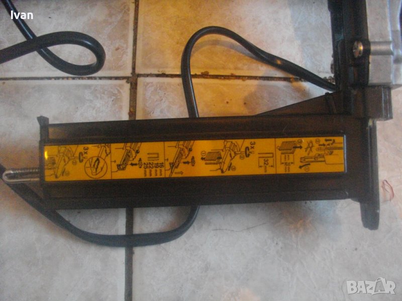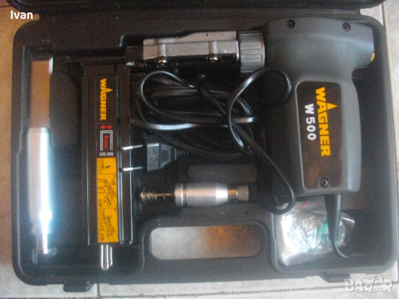 ОПИСАНИЕ на електрически комплект Вагнер - 3в1. Цена 299 лв. Машината е една, като към нея има 3 различни приставки - ел. такер за скоби, ел. чук за забиване на пирони и ел.длето. Марка и модел на комплекта WAGNER W 550 Typ 0177 B.Старото немско оригинално качествено производство от 1990 г. Комплектът е нов, в пълна и отлична техническа/работна изправност. Време на работа с 1 пуск на машината KB - 15 min. Такера е за сколи размер 6 мм ширина и дължина 16-25 мм. Скорост на удара - 100 м/сек. Голям метален пълнител на такера. Към него има около 30 бр. оригинални скоби за проба и тест. Приставка ел.длето - голямо, масивно, с алуминиев корпус. Цялостна дължина на приставката - 180 мм, работна ширина на острието - 25 мм, дължина на острието - 70 мм. Острието е от закалена инструмента стомана с голям наклон ъгъл на заточване - наклон 10 мм. Приставка чук пистолет за забиване на пирони - забива пирони стоманени и видирани без глава и с глава. Диаметър на отвора за глава на пирон ф 5 мм. Комплектът е прибран в оригинален на марката и модела твърд пластмасов куфар с фабричното лого. Тегло на колекта - 3,2 кг.