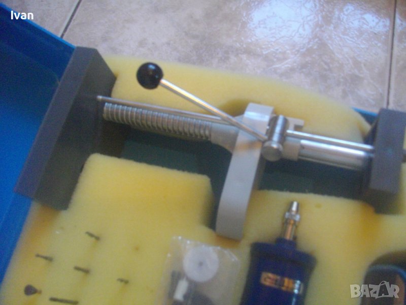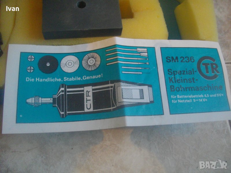 ОПИСАНИЕ на ел. мини дрелка-шлифовалка в светло син куфар. Цена 159 лв. Старо немско оригинално качество. Съвсем нов комплект, неизползван и неупотребяван. Машината работи на 220 волта през трафт/адаптер 4,5-9 волта, който не е включен в комплекта. Отлиично техническо/работно сътояние на комплекта. Марка и модел - CTR SM236. Spezial Bohrmaschine 4,5 V und 9 V fur Netzteil 9-14 V. Налична е оригиналната стойка на машината за изправен стоеж. Височина на стойката - 210 мм, работен ход на стойката - 50 мм. Модел на стойката и производител - Bohstander BST 237 - CTR Elektronik Nurnberg. Трафт липсва към машината. Мога да дам някакъв трафт от винтоверт волтаж 4,5 - 14,4 волта /същите са/ за машината. Поставена цанга с притягаща гайка на машината. В комплекта са включени приставка за прехвърляне волтаж от 4,5 на 9 волта за машината, 2 цанги различни за главата, други 31 бр. аксесоари, друга кутия с 4 различни цанги, 5 различни мини бургии. Друга кутия с други 2 р. аксесоари. Размери на шлифовалката - дължина 125 мм. Машината е специализирана за работа в труднодостъпни места и при мини детайли. Комплекта е прибран в оригинални ясин куфар на марката и модела в дунапренена вложа за компонентите. Тегло на комплекта - 1,5 кг. Цената не се коментира - 159 лв.