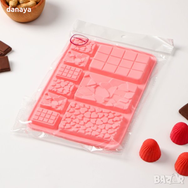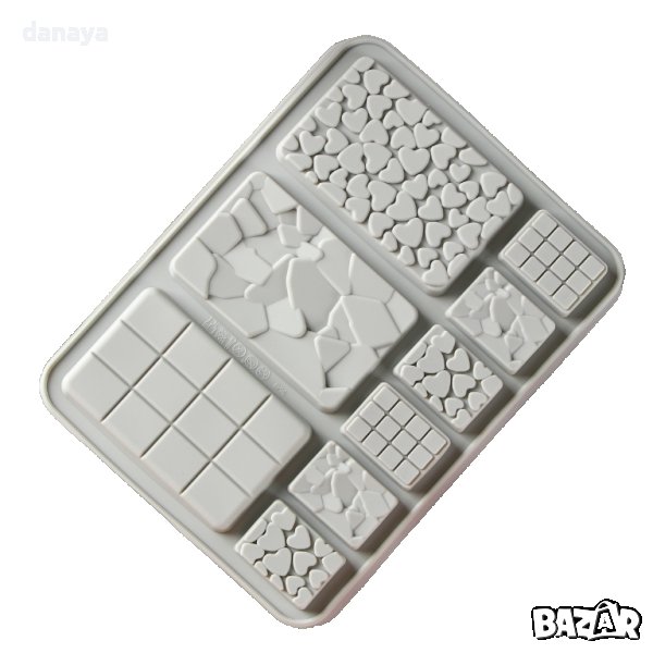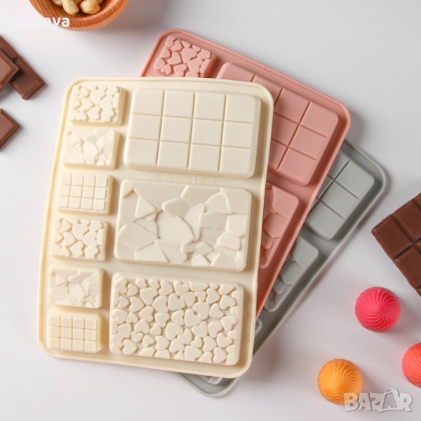 Силиконова форма за плочки шоколад и шоколадови барчета. Тавичката има 3 по-големи гнезда за плочки шоколад и 6 по-малки гнезда за малки парченца шоколадови изкушения с различна отливка.