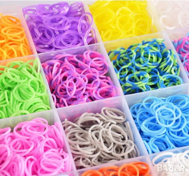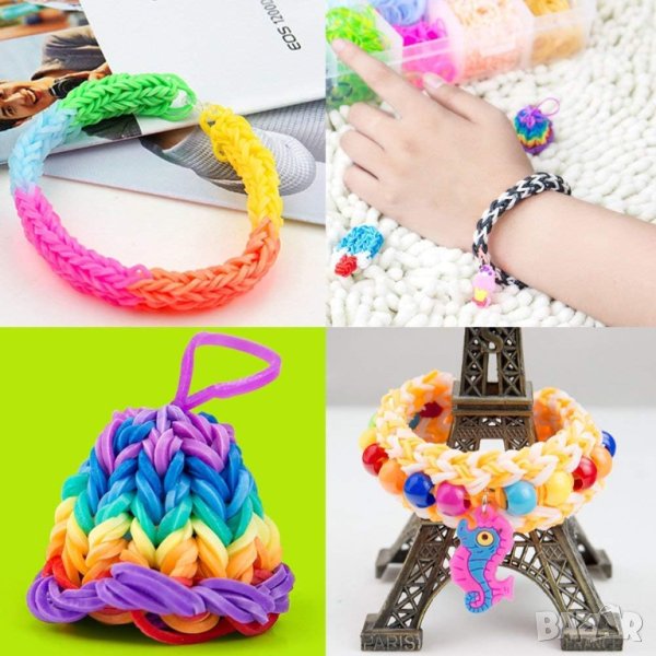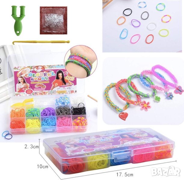 Комплектът включва 4400 ластичета в 22 различни цвята, 10 малки кукички, 100 S