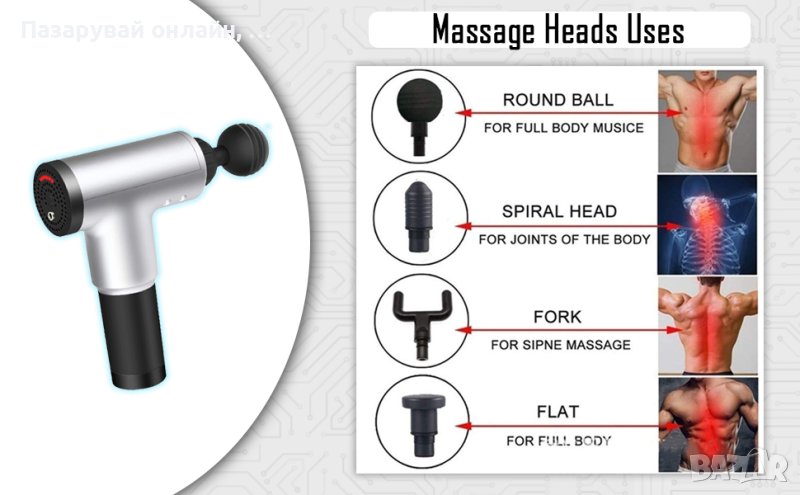 Този масажиращ пистолет има редица разнообразни приложения. В комплекта ще получите 4 различни по вид приставки, които съответно имат и различни приложения: