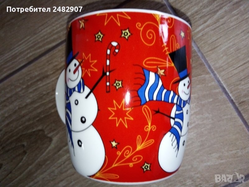Нова коледна порцеланова чаша с дръжка в луксозна подаръчна кутия. Диаметър на чашата в горната част - 8,5 см, височина - 9 см. Размери на кутията - 14,5/10/9 см.