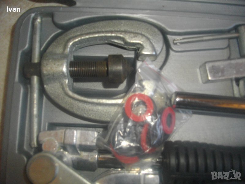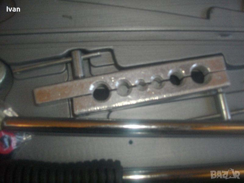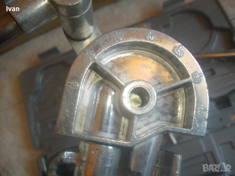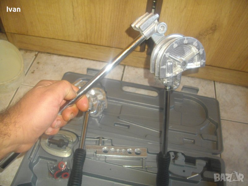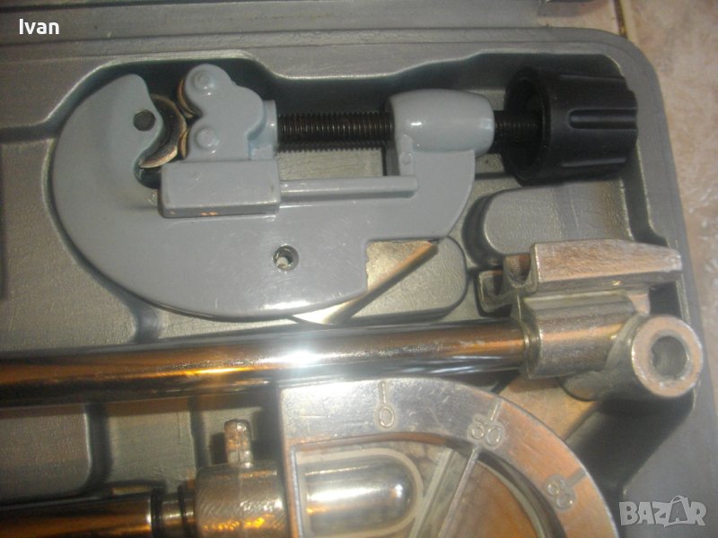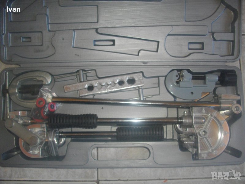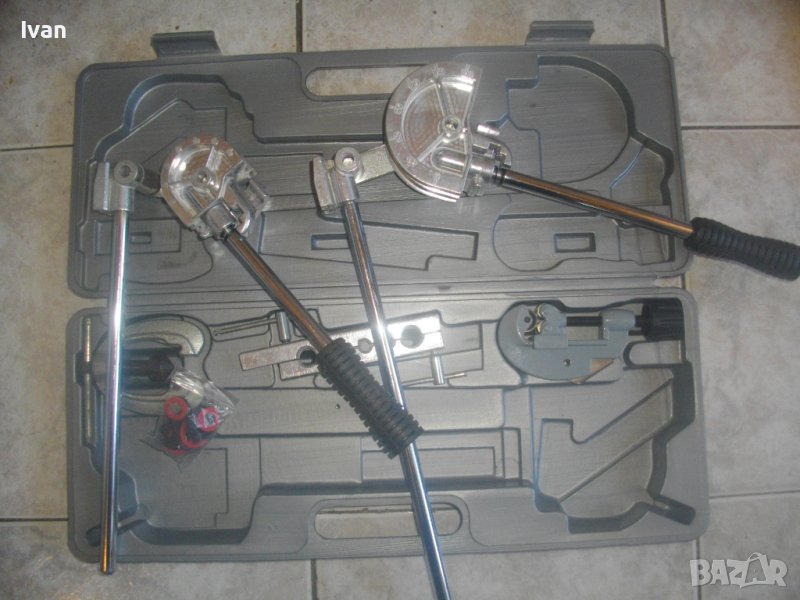 ОПИСАНИЕ на нов чешмеджийски ремонтен комплект - цена 299 лв. Производство и маркировки не са упоменати. Съвсев нов, неизползван и неупотребяван. Комплектът включва 2 бр. тръбоги уреди за огъване на тръби - единия е троен, с размери за огъване 8 мм, 10 мм и 12 мм, разграфена глава 0-180 градуса и радиус на огъване 30 мм. Дължина тръбогиба - 300 мм. Другия тръбогиб е двоен с размери за огъване 14 мм и 16 мм. Разграфена глава 0-180 градуса, радиус огъване - 45 мм. Дължина на тръбогиба - 350 мм. Резонарезна конусна дъска рамери от 6 мм до 16 мм. Шабър притисквач за даската. Тръборез малък метален размери за разяне трби 1/4 - 1 1/4 - 6 мм - 26 мм - отваряне 30 мм, резец от закалена инструментална стомана ф 20 мм. В коммплектът има и оригинален плик с резервни гумени уплътнители около 20 на брой, различни размери. Оригинален твърд пластмасов куфар с размери 470 х 185 х 50 мм. Тегло на комплекта с куфара - 4,5 кг. Цена на комплекта - 299 лв.