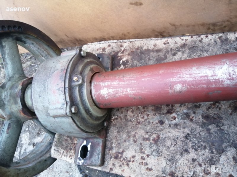 Продавам масивен маховик с вал и лагери, дължина 110 сантиметра, диаметър на вал 110 мм, диаметър на шайба 55 см, дължина на лагери 43 см, тегло 220 килограма