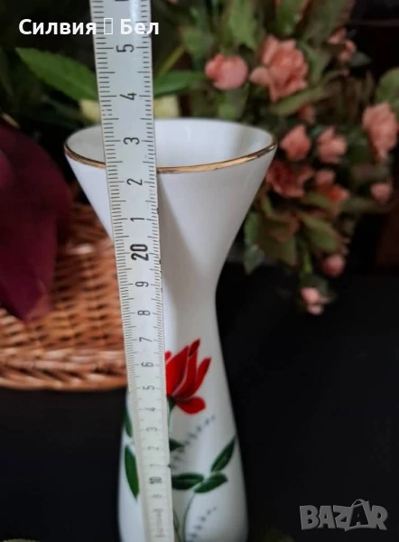 Вазата е с класическа изтънчена форма, златен кант по ръба и красив мотив на червена роза.