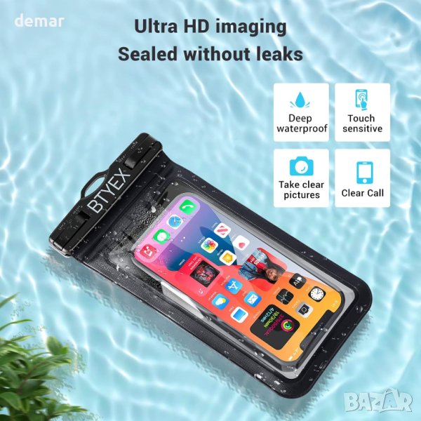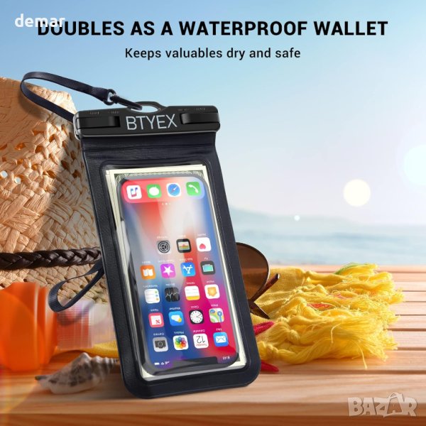 Водоустойчивият калъф за телефон BTYEX предлага 100% водоустойчива гаранция, перфектен за всякакви условия, от екстремен каяк до разходки по плажа, със сертификат IPX8, тестван на 30 метра дълбочина за 30 минути, осигурявайки водоустойчива, снегоустойчива и устойчива на мръсотия защита. Идеален за различни дейности, включително плуване, сърфиране и водни спортове, той разполага с 0,3 mm PVC за висока прозрачност и чувствително докосване, въпреки че функционалността на сензорния екран може да бъде ограничена под дълбока вода, където вместо това могат да се използват бутони за сила на звука за снимки. Съвместим с почти всички телефони до 7 инча, като модели iPhone, Samsung Galaxy и Huawei, също така позволява носене на документи и пари в брой.