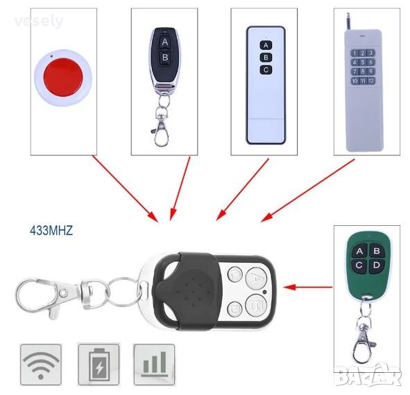 (копиране, дублирате) на почти всички дистанционни работещи на честота 433mhz и 433.92mhz дистанционни на гаражни врати, автоматични бариери с честотен диапазон 433mhz и 433.92mhz ,