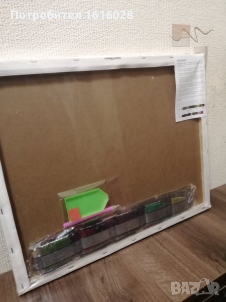 Нов голям диамантен Гоблен опънат на платно - картина..Във комплекта се съдържа по 1 отпечатано платно опънато на дървена рамка,стрази с различни цветове,1 малък поднос за подреждане на диаманчетата, 1 молив за хващане на диаманчетата,1 восък. Диамантчетата се подреждат на определените места,като се следват буквите,цифрите,знаците и цветовете отговарящи на тях.