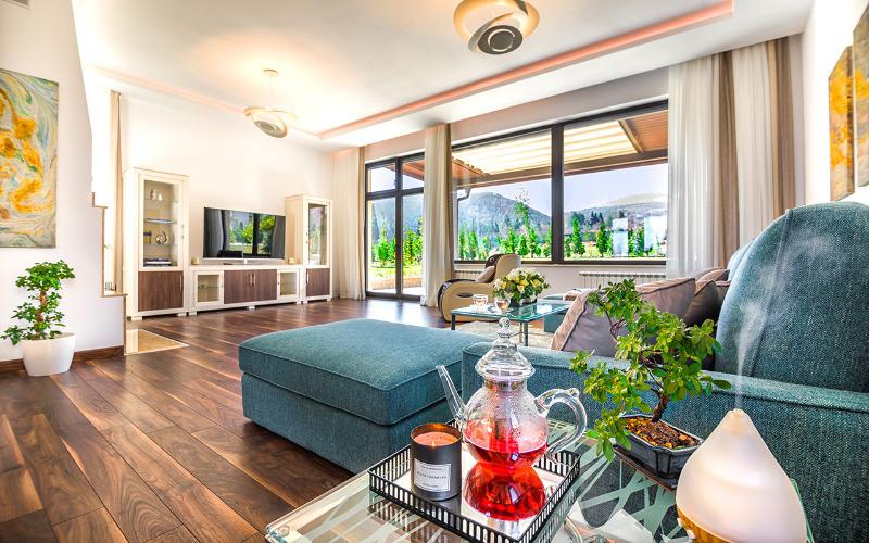 Всички къщи са луксозно, поръчково обзаведени и разполагат с хол с трапезария и кухня, две веранди, четири спални всяка със собствени баня и WC, гардробно и тераса. Всяка къща разполага с два гаража и четири паркоместа. На покрива има панорамна тераса.