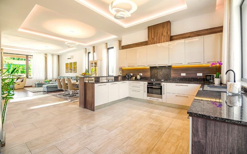 Подови настилки: гранит, мрамор, гранитогрес и ламиниран паркет.