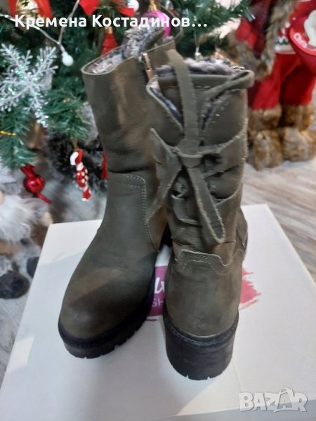 Тъмно зелен набук с дебела агнешка вата. Подметката не се хлъзга. Много топли, с възможност за регулиране височината на конча, отзад имат връзки. Срахотни са! Височина на тока 6см. Цяластна висачина на ботата с тока 23.5см. , само конча 17.5см. Изключително запазени. На някой от снимките се виждат отблясъци - нямат забележки, това е от светлината!