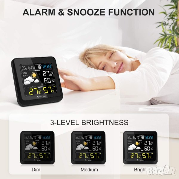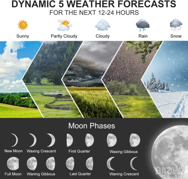 и влажност, барометрични данни, прогноза за времето, фаза на луната, аларма,