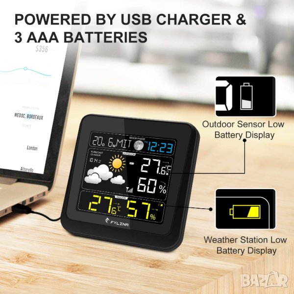 батерия, външният сензор се захранва от 2 x AAA батерии (батериите не са