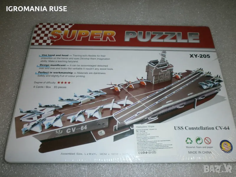 3Д Пъзел 3D Puzzle модел на кораб /ship/ самолетоносач /aircraft carrier/- 34/10/24 см. 83 части /pieses/,ниво на трудност /difficulty level/ 4 от 5. Цена 3 EU