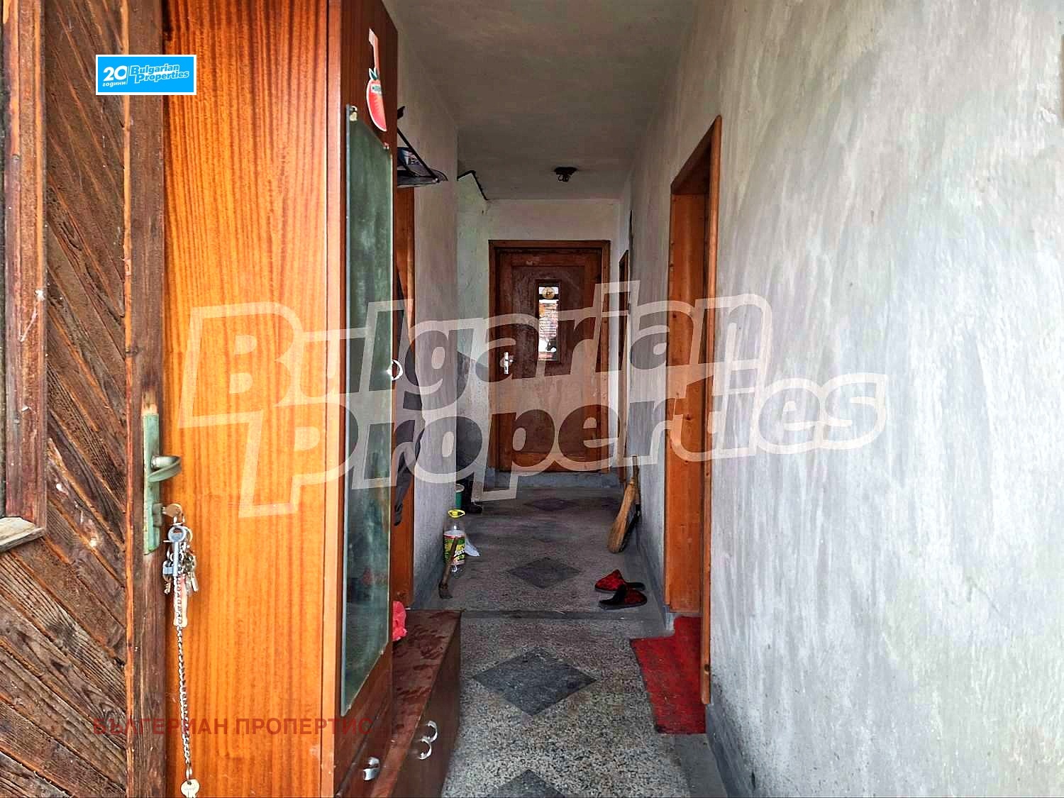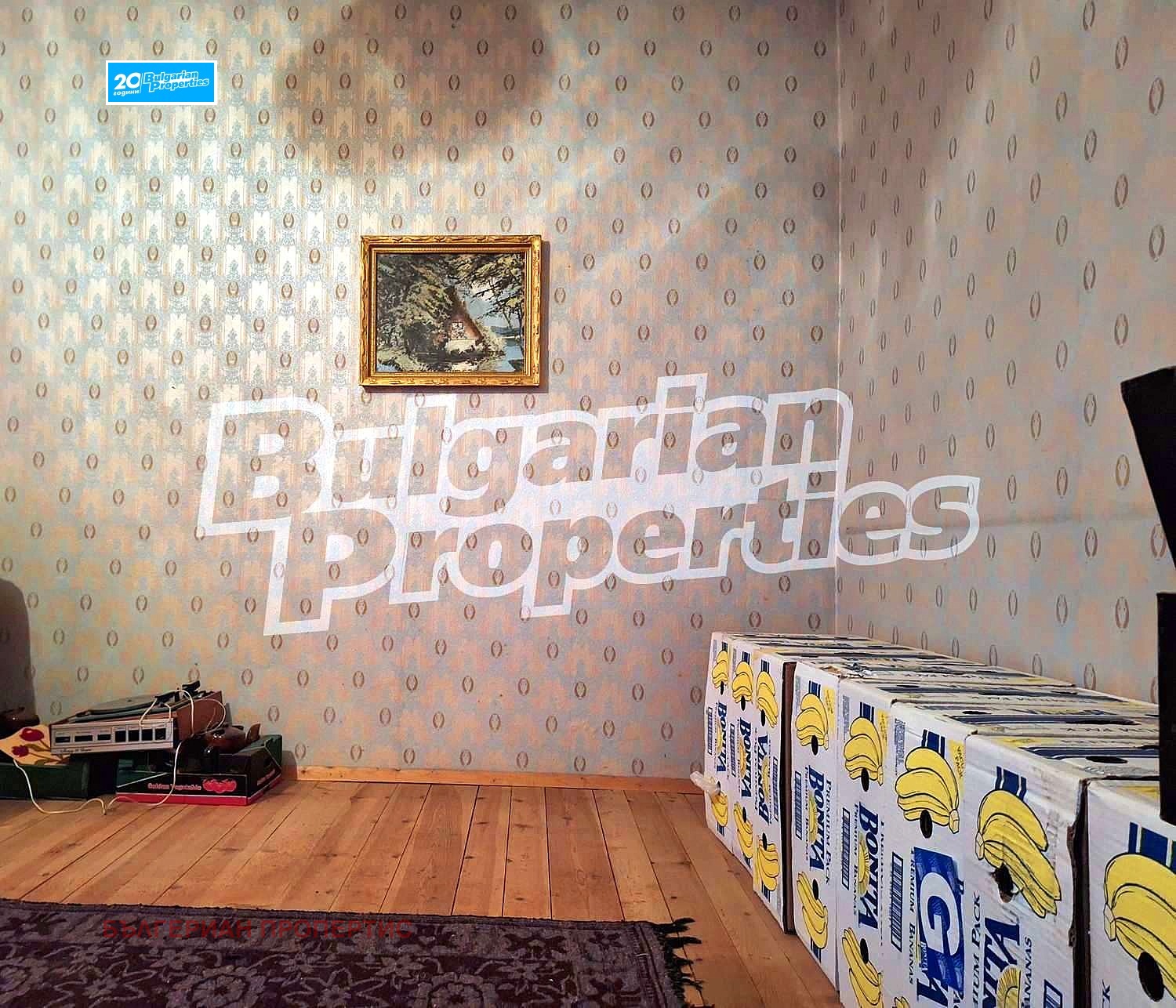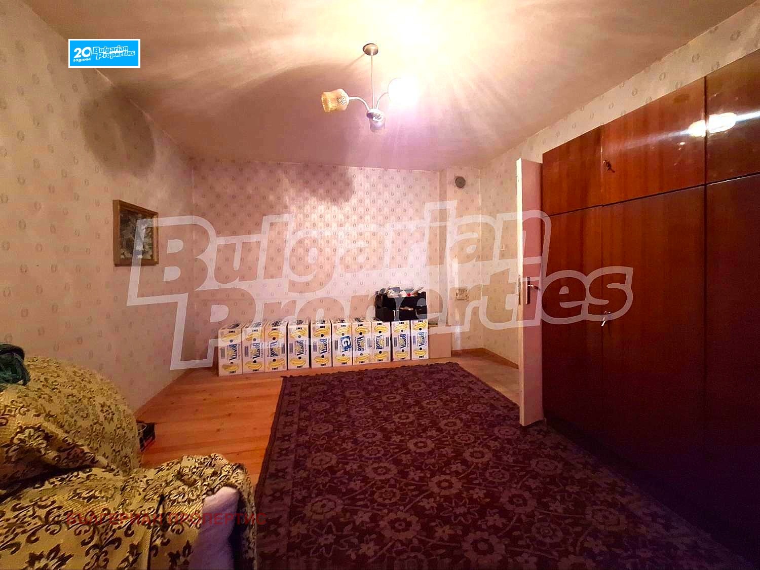 Стените в стаите са покрити с тапети, подовата настилка е дюшеме в отлично състояниe, дограмата е стара дървена.