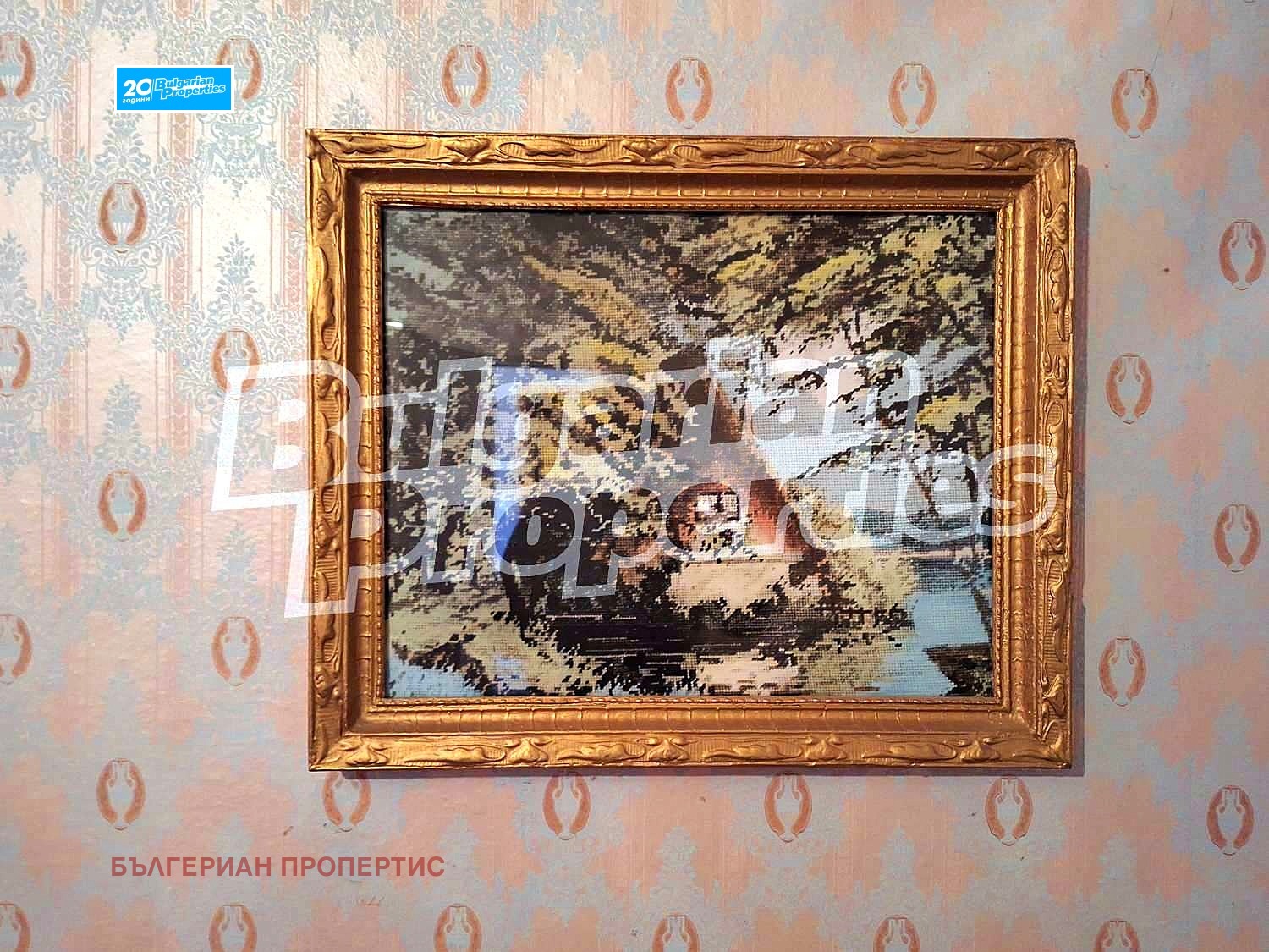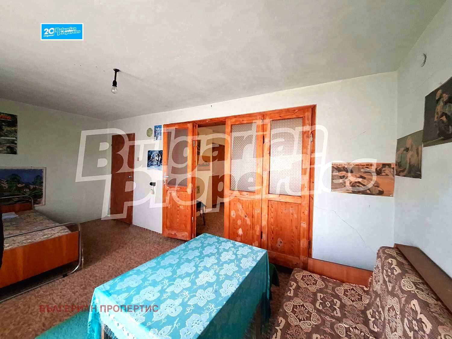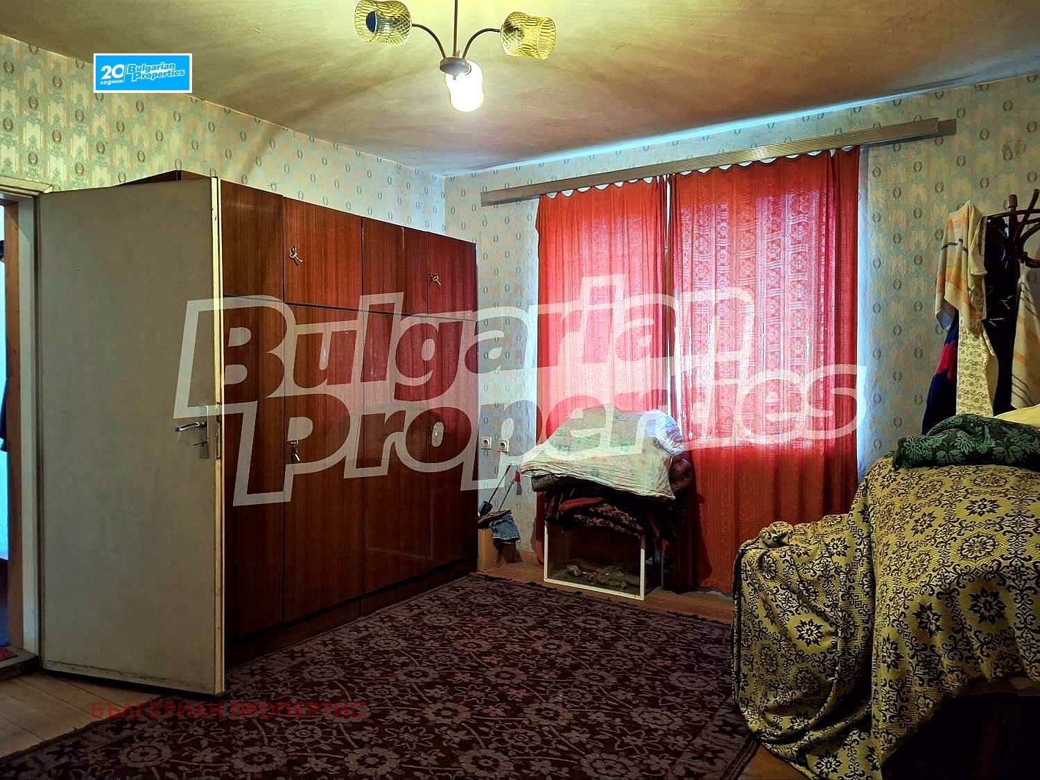 Стените в стаите са покрити с тапети, подовата настилка е дюшеме в отлично състояниe, дограмата е стара дървена.