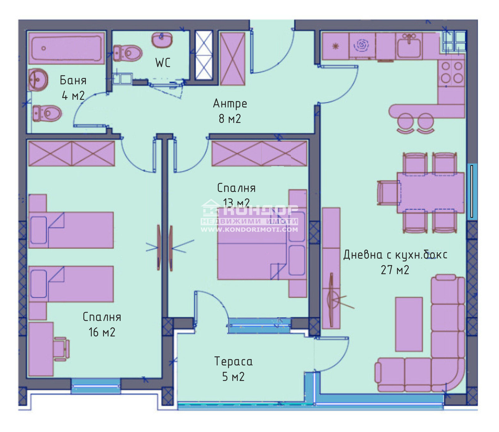 Оферта 63317: Прекрасни просторни жилища и за продажба в НОВА ГОТОВА СГРАДА в близост до търговски център, големи вериги магазини, и учебни заведения! Новият жилищен комплекс се отличава с простор и открити гледки, контролиран достъп на автомобили и луксозно завършени общи части. Апартаментът, който Ви предлагаме е тристаен с изложение ЮГ/ИЗТОК, състои се от входно антре с място за гардероб, слънчева ъглова дневна 27кв.м., две самостоятелни спални: родителска 13кв.м. и детска 16кв.м., баня с тоалетна, втора тоалетна и една тераса. Към апартамента има прилежащо избено помещение включено в цената. Степента на завършеност на апартаментите е съобразно всички съвременни изисквания с блиндирана входна врата, под - циментова мазилка, тавани и стени - гипсова мазилка, електрическа инсталация до ключ и контакт, многокамерна PVC дограма, напълно завършени тераси и просторна стълбищна клетка, безшумен хидравличен асансьор. Към всеки апартамент се закупува подземно или надземно паркомясто. Гъвкава схема на разсрочено плащане с отстъпки при по-висока първоначална вноска. Осигурено банково кредитиране на специални условия за нашите клиенти от водещи банки.