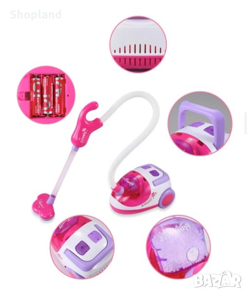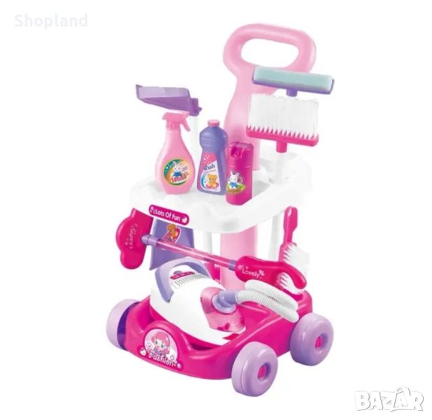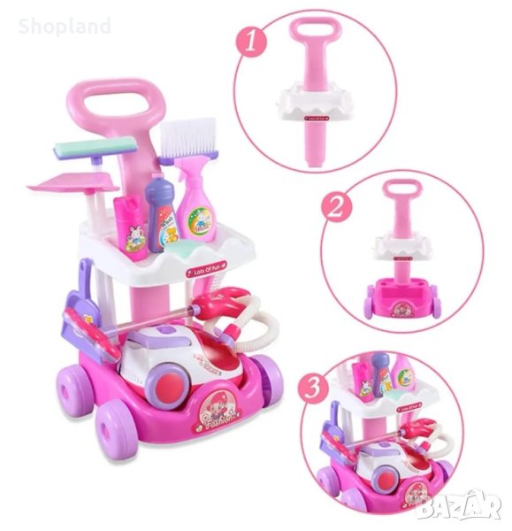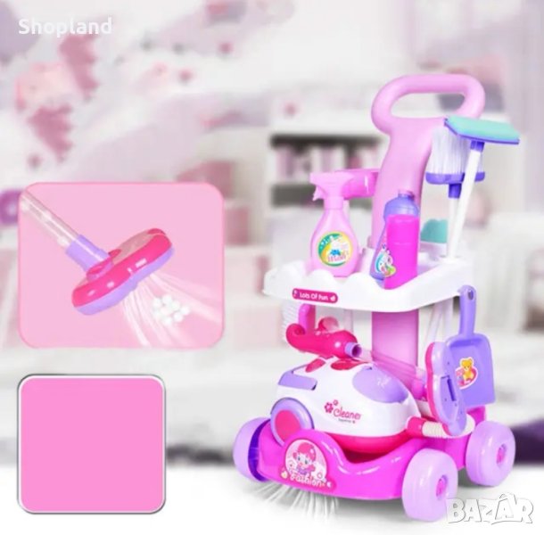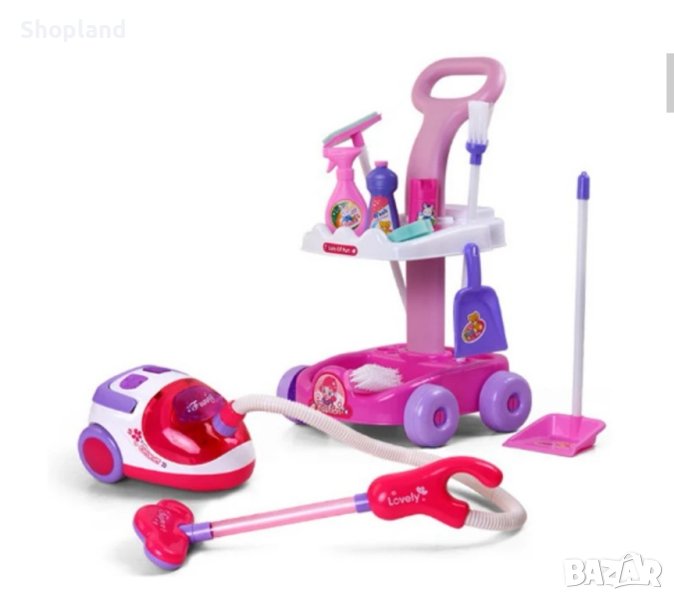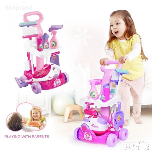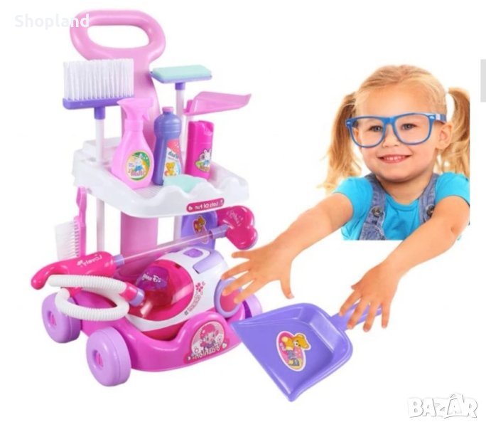 Представяме ви детският комплект за почистване, който ще научи вашите деца на помощ в домакинството по забавен и интерактивен начин. В него се съдържат всички необходими инструменти за почистване на дома - прахосмукачка, моп, метла, лопата с дълга дръжка, четка, малка лопата, гъба, количка на четири колела, имитация на шишета с почистващи препарати.