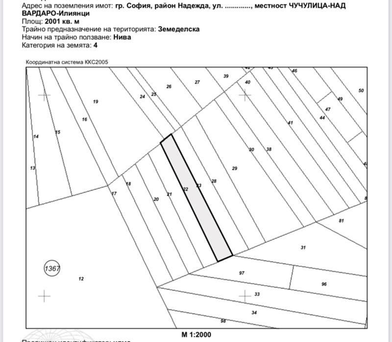 Ние Ви предлагаме поземлен имот с площ 2001 кв.м., категория 4-та в гр. София, район Надежда, м. Чучулица-Над Вардаро-Илиянци. Намира се в близост до Северна скоростна тангента и Промишлена зона Илиянци. Района е бързо развиващ се и в перспектива за регулация , имота попада в промишлена зона. Отлична инвестиция!!!