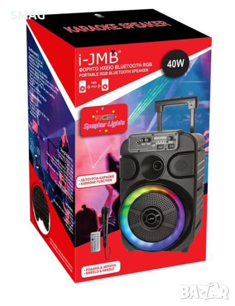 Високоговорител със зарядно устройство (DC 9V), 7.4V 2400mA батерия, цветни LED светлини, AUX вход, MIC, Led панелен дисплей и FM/TF/BT/AUX функция. Време за зареждане около 3-4 часа и време на работа при умерен интензитет около 4-5 часа. Разполага с микрофон, дистанционно управление, дръжка и колелца за лесно транспортиране.