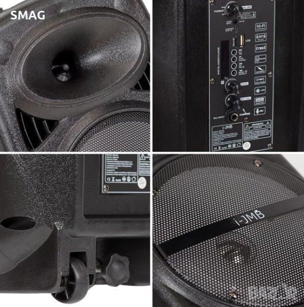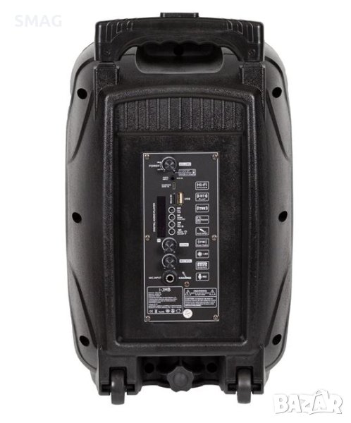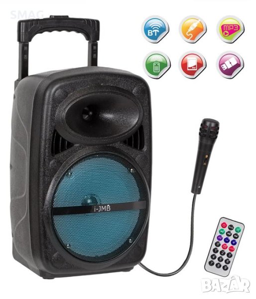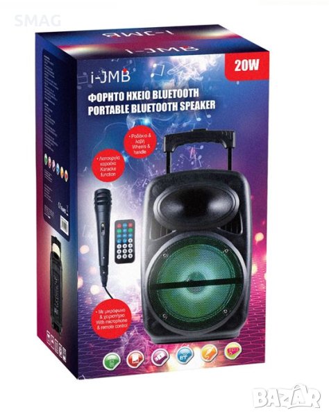 Преносима bluetooth колонка с функция караоке, с микрофон и управление. Има колела и дръжка, която може да се регулира на височина 66см и 87см. Характеристики: USB/TF/FM/Bluetooth функция, порт за слушалки (350-400mV), DC 5V зареждане, TWS функция (едновременно сдвояване на 2 едни и същи високоговорителя), 20W изход, честотна характеристика 100Hz-18Khz, усилвател на мощността на сигнала и шума 65db, време за възпроизвеждане/нормална сила на звука 3-4h, обхват на работа 10m, акумулаторна батерия 3600mAh. Съвместим с MP3, мобилен телефон, таблет, компютър. Съдържа инструкции.