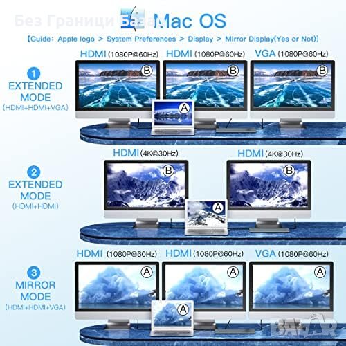 - Троен Дисплей: 2x HDMI (3840x2160@30Hz) и 1x VGA (1920x1080@60Hz).